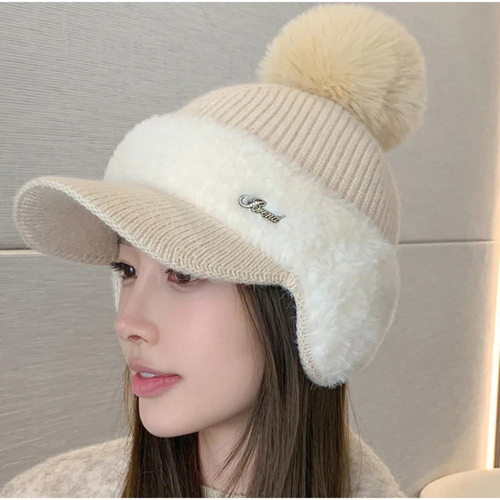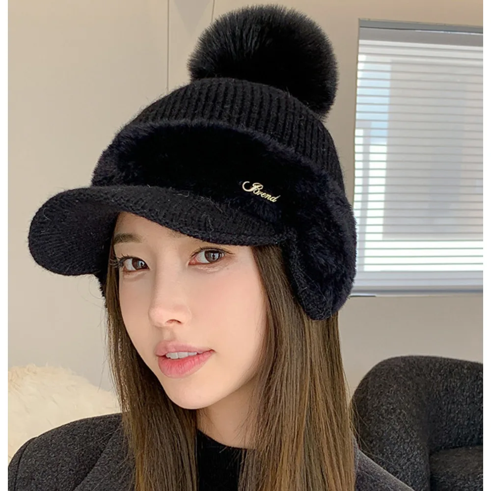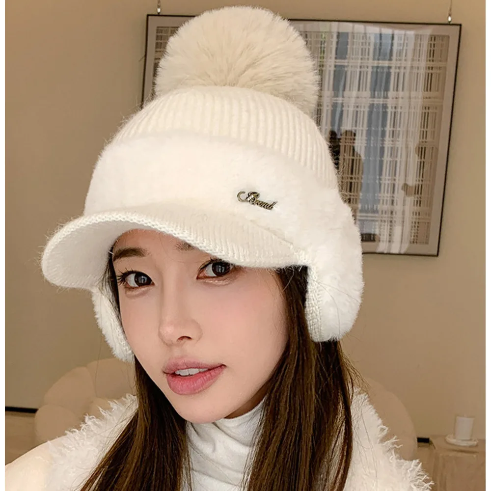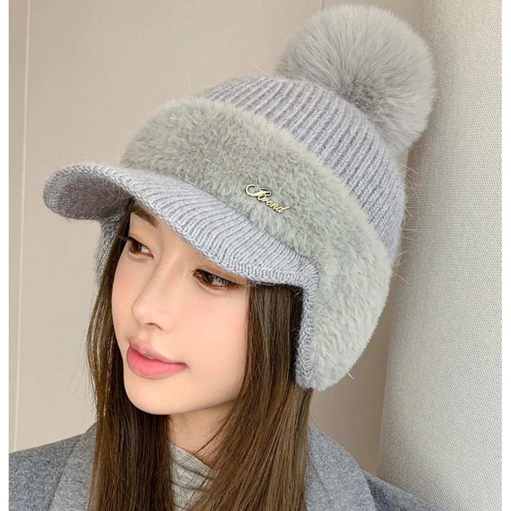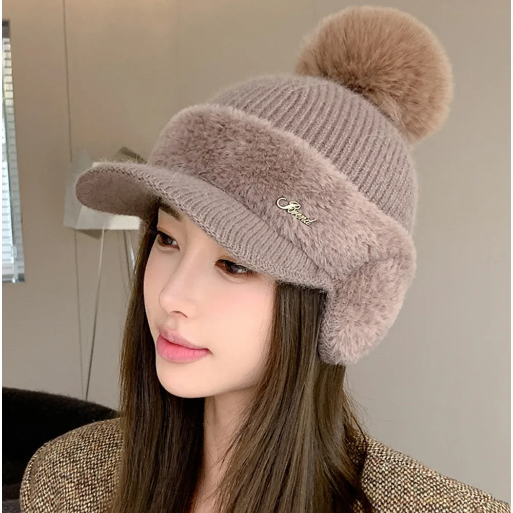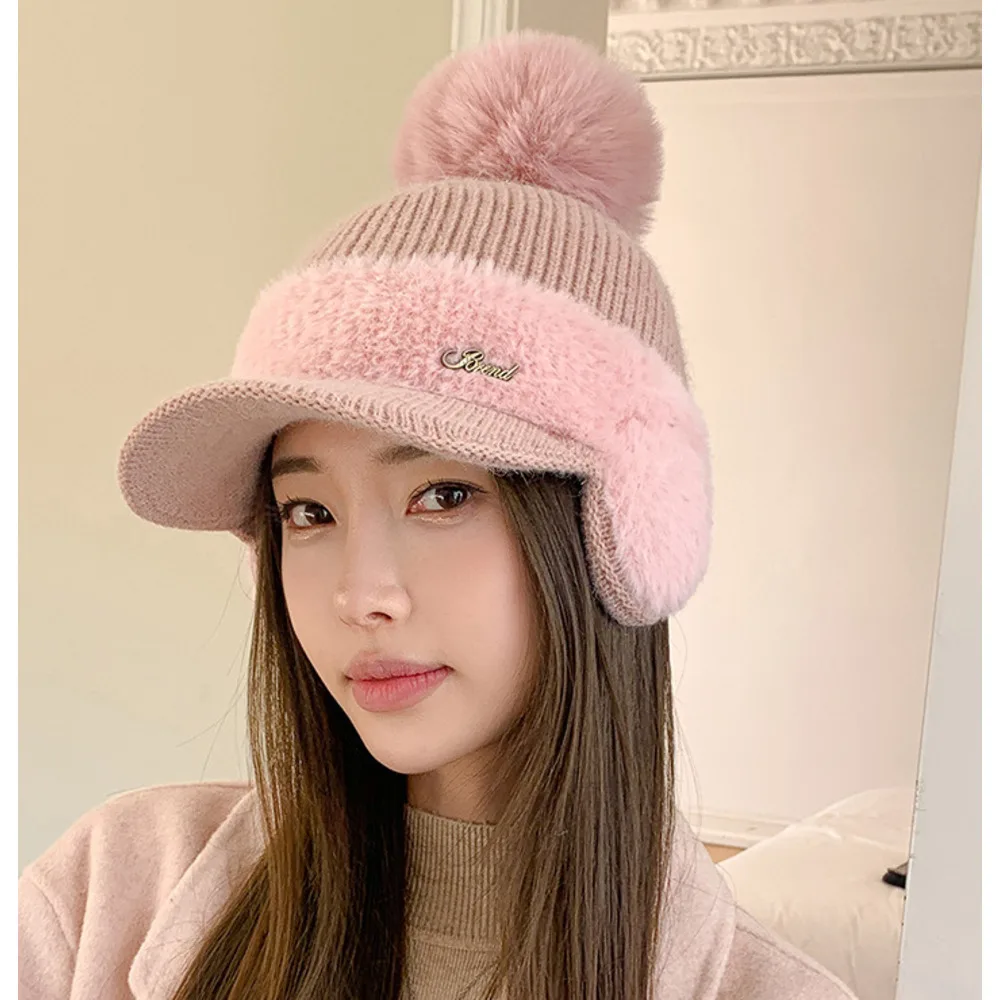 Nuovo berretto da baseball invernale in pelliccia di visone con protezione per le orecchie in pelliccia di coniglio per le donne, moda coreana, tinta unita, semplice cappello lavorato a maglia con palline di lana