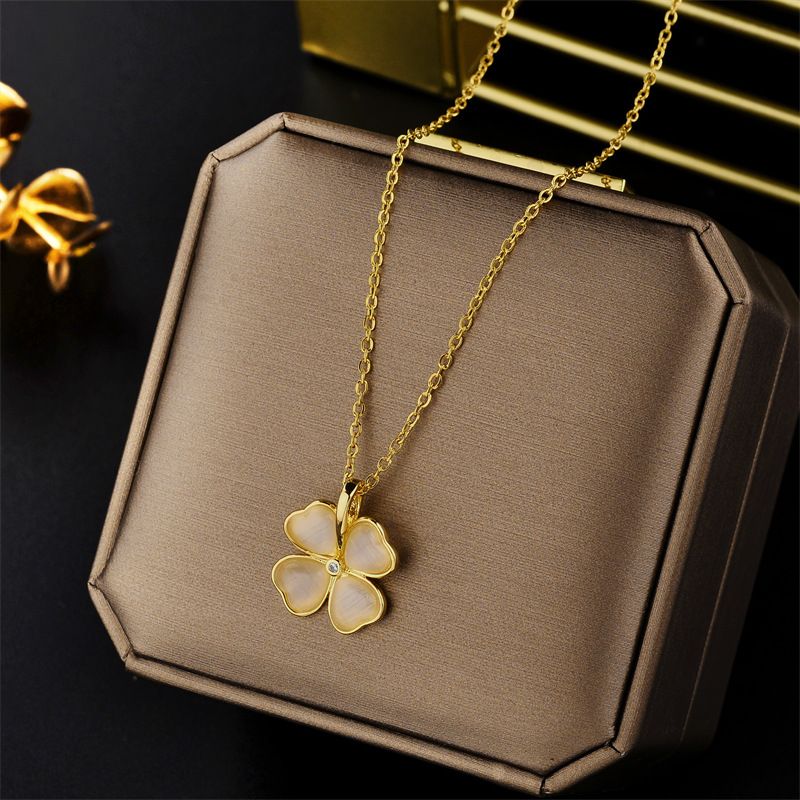 New Fashion Gold Flower Clover Titanium Steel Necklace with Cat's Eye Stone Inlaid, Mesh Red Collar Chain Women's Accessories