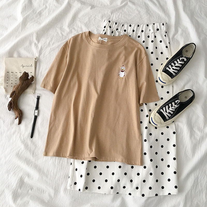 Nuova maglietta sudcoreana a maniche corte da studente con ricamo a forma di animale della Corea del Sud, girocollo, abiti estivi, vestibilità ampia, per donna