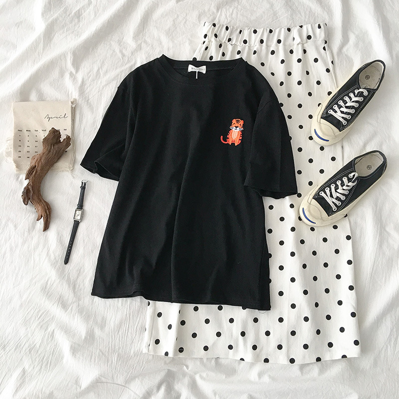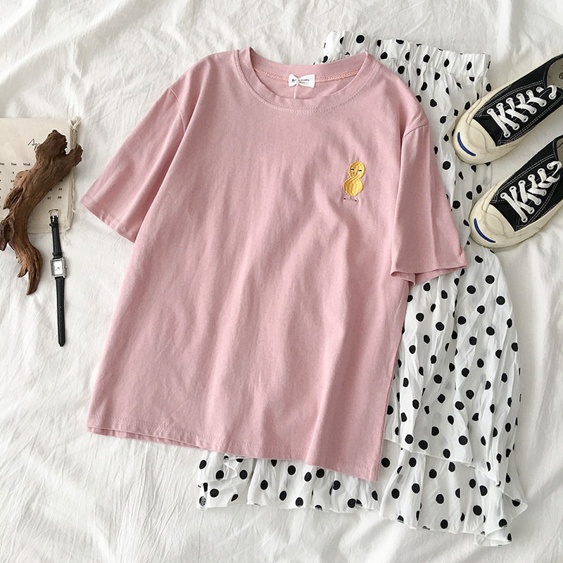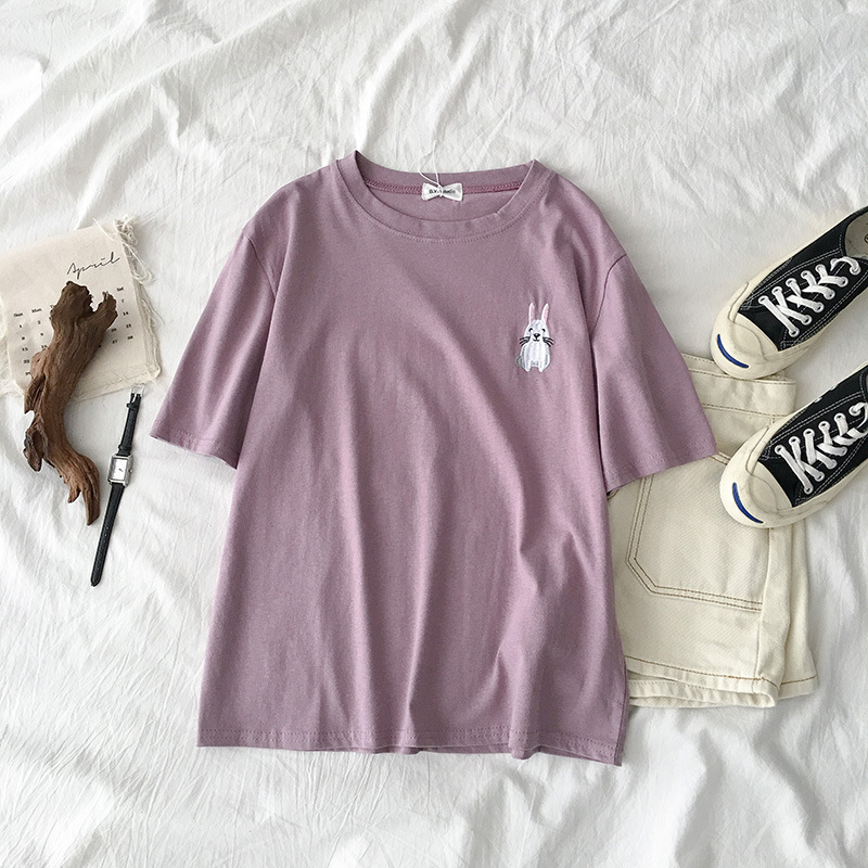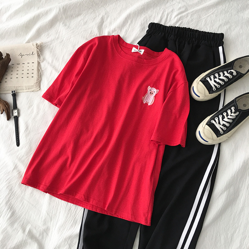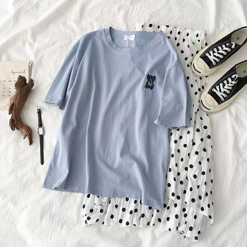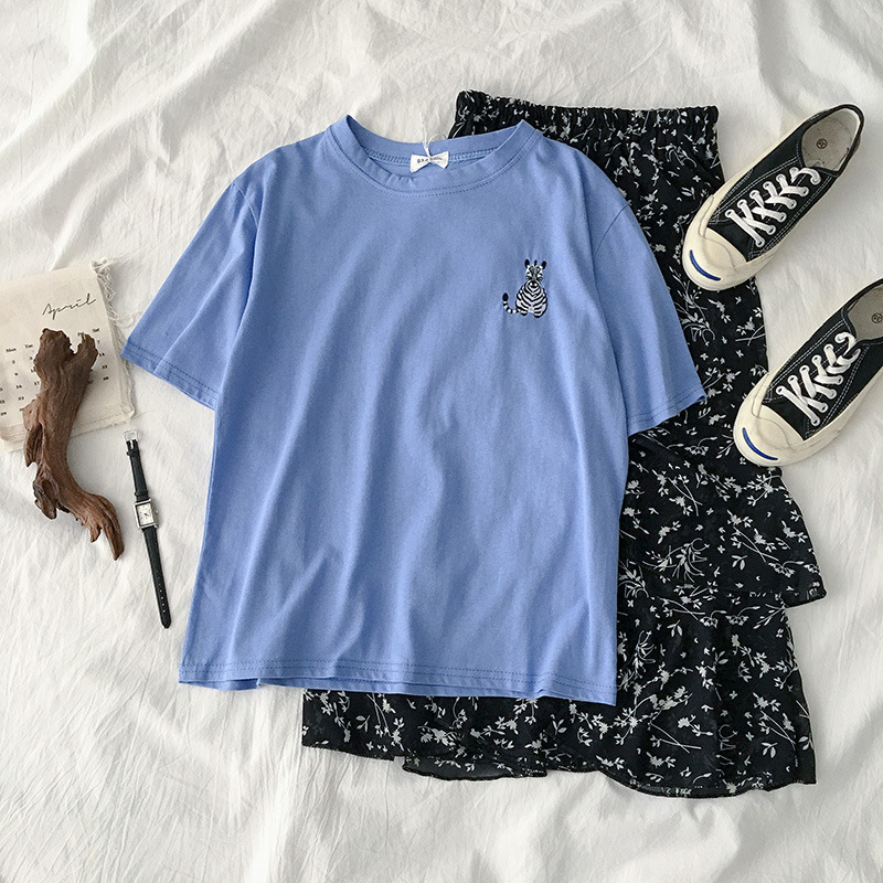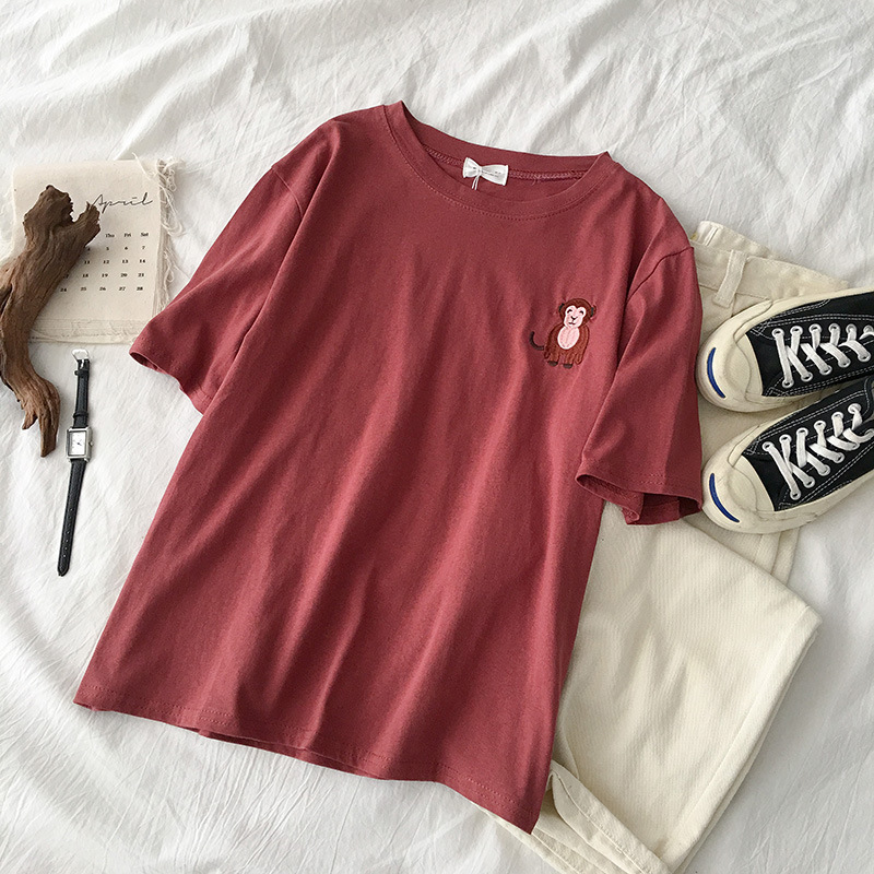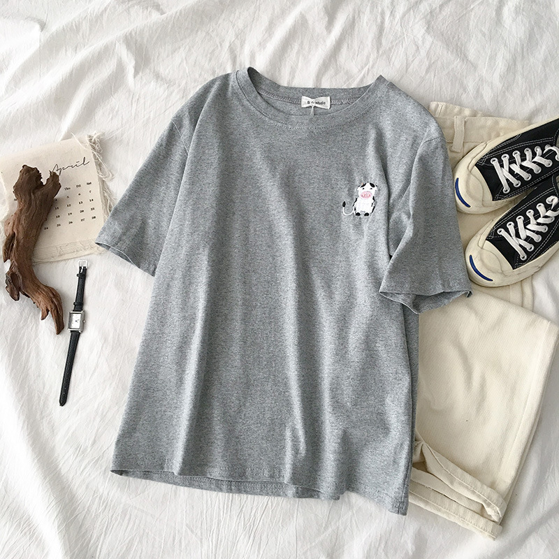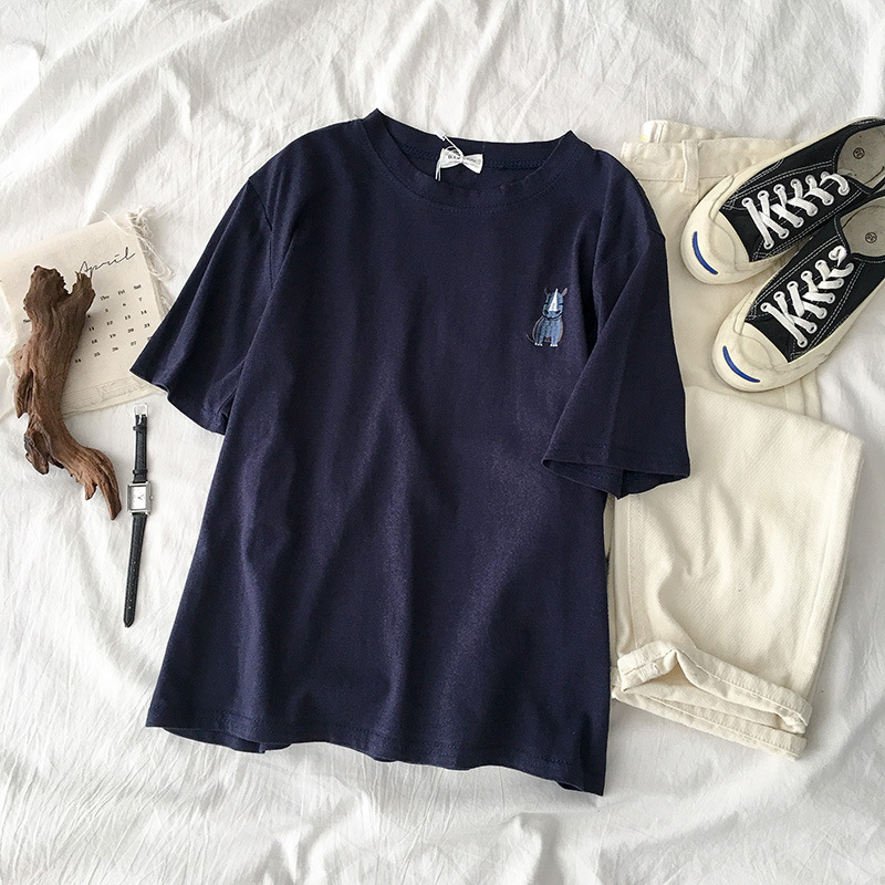 New South Korean animal embroidery round neck clothes for women's summer loose fitting student short sleeved T-shirt for women's casual top