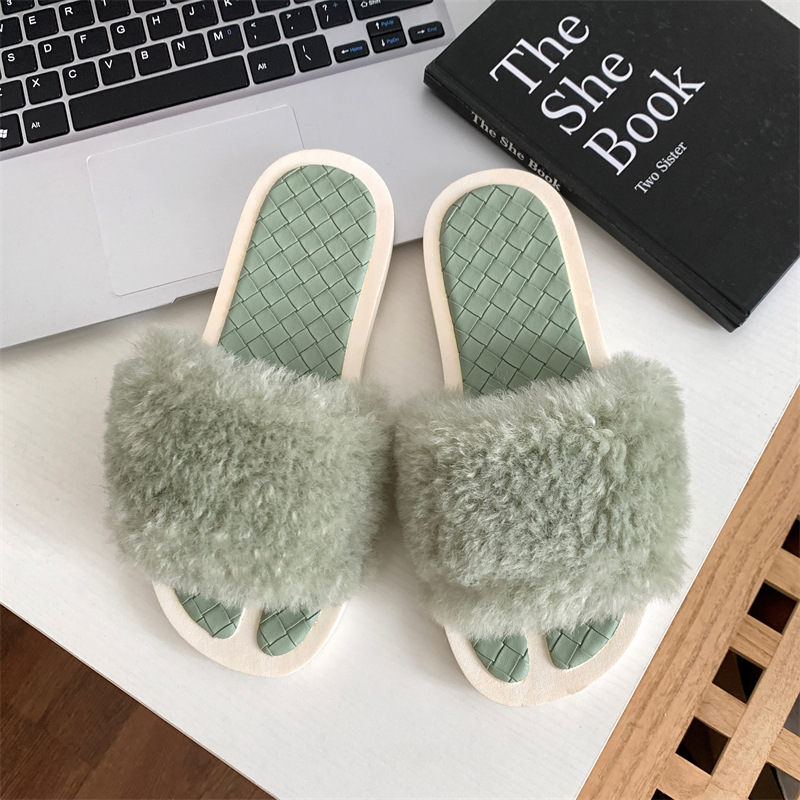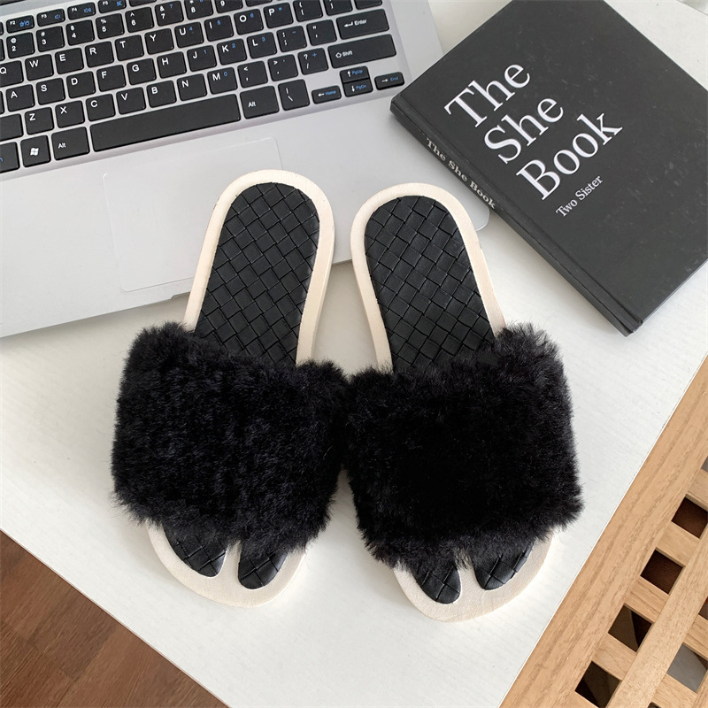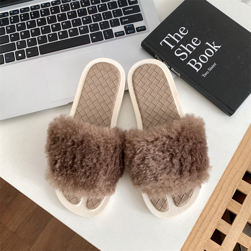 New casual and fashionable plush cotton slippers for girls, one line anti slip and wear-resistant for home wear, flat bottomed plush slippers for outdoor wear