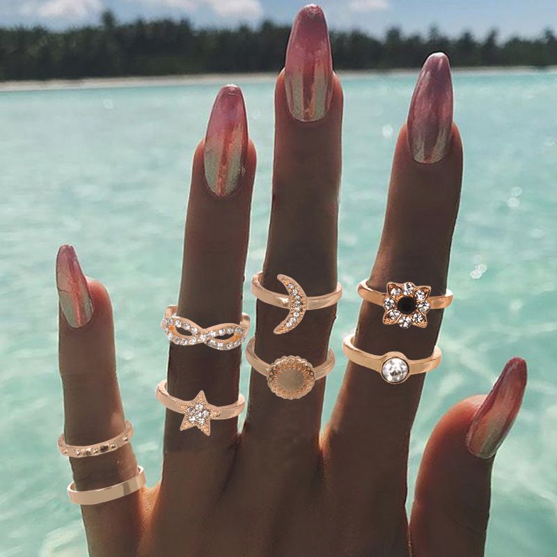 Nuovi gioielli in vendita rapida con diamanti semplici, stelle, fiori di luna, set di anelli da 8 pezzi per donna