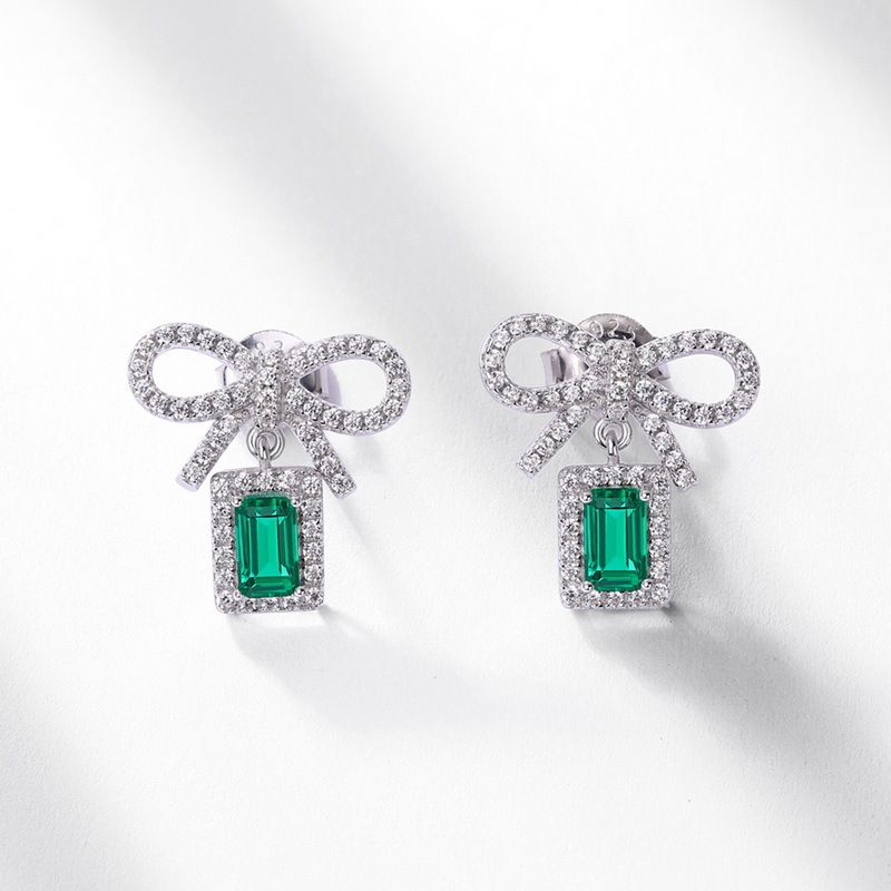 Nuovi orecchini a bottone in argento con smeraldo coltivato, eleganti e di alta qualità, con fiocco e luce.