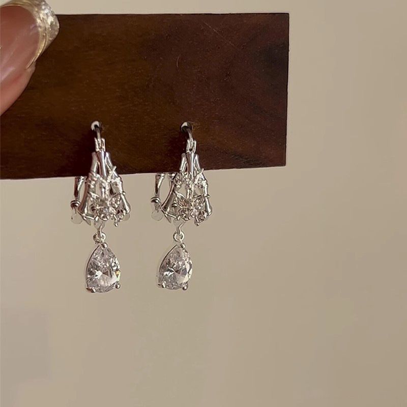 New Chinese Style Bamboo Water Drop Zircon Earrings for Women, Niche Design, Cool and Minimalist Hollow Butterfly Earrings