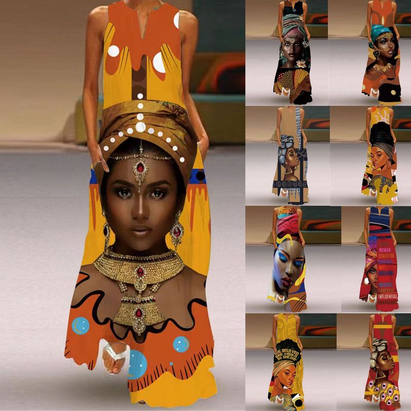 New Summer Women's Sleeveless Long Dress V-neck Printed Face Dress Women's Wear