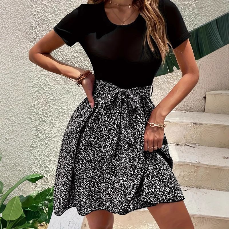 Nuovo abito lungo con cintura e stampa vegetale a maniche corte e scollo rotondo 2025