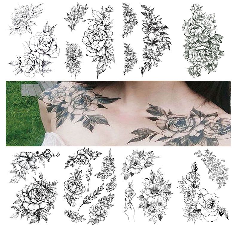 Nuovo adesivo per tatuaggio a forma di fiore dipinto a mano, in bianco e nero, impermeabile e di protezione ambientale