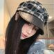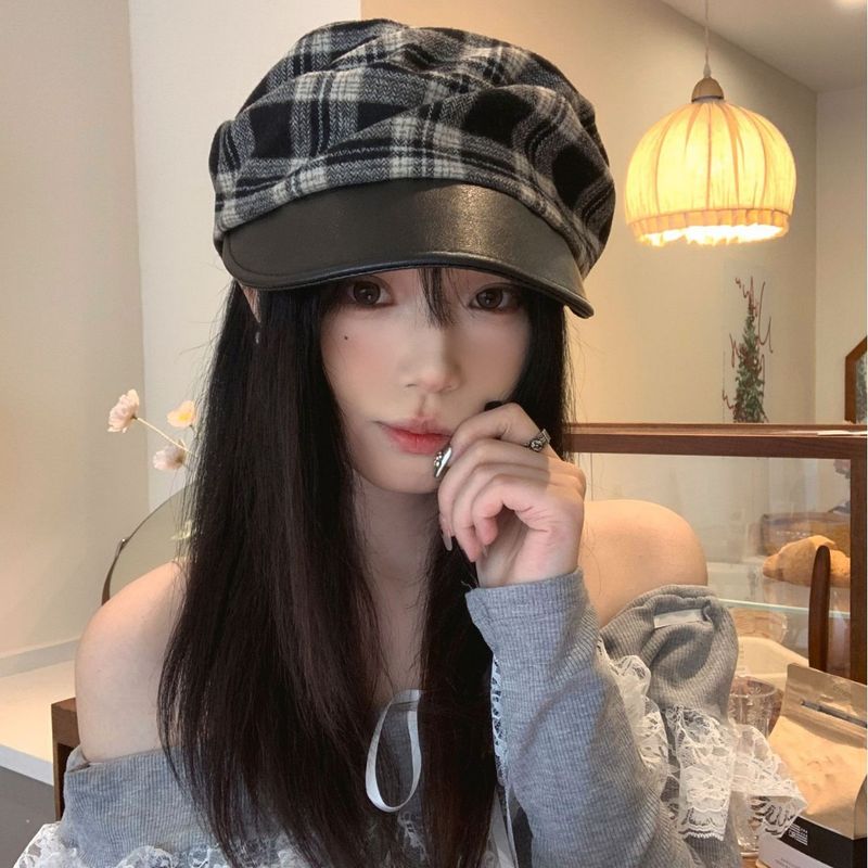 Checkered Wool and PU Leather Patchwork Octagonal Cap 2025 Fall/Winter New Women's Versatile Beret