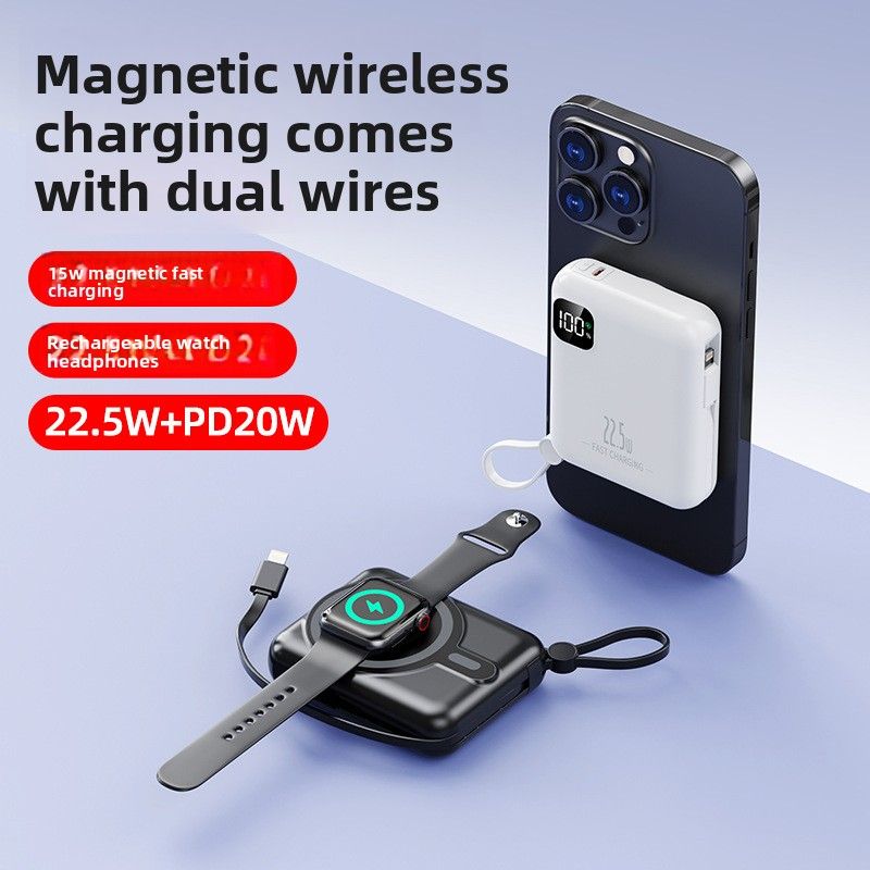 Nuovo modello transfrontaliero con cordino, mini power bank magnetico portatile 3 in 1 con doppi cavi per la ricarica