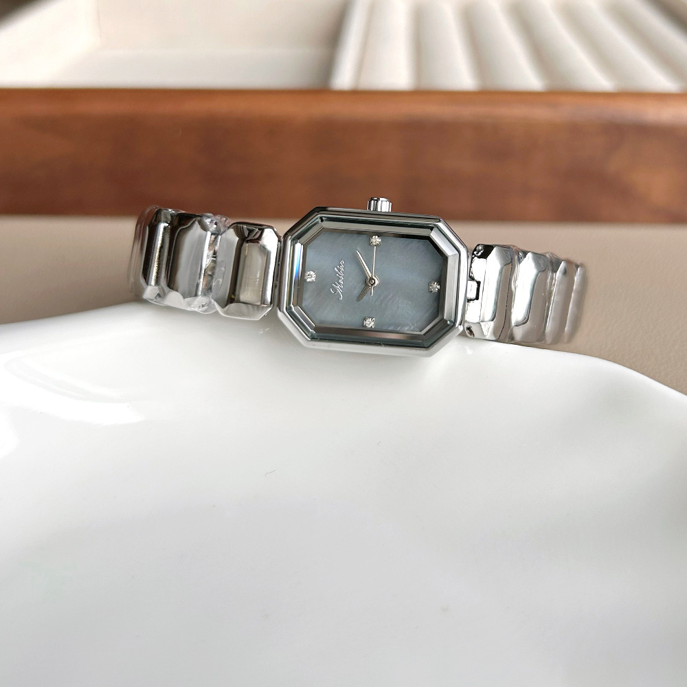 Nuovo orologio alla moda di alta qualità con cinturino in acciaio argentato e quadrante in madreperla a forma di cubo di zucchero