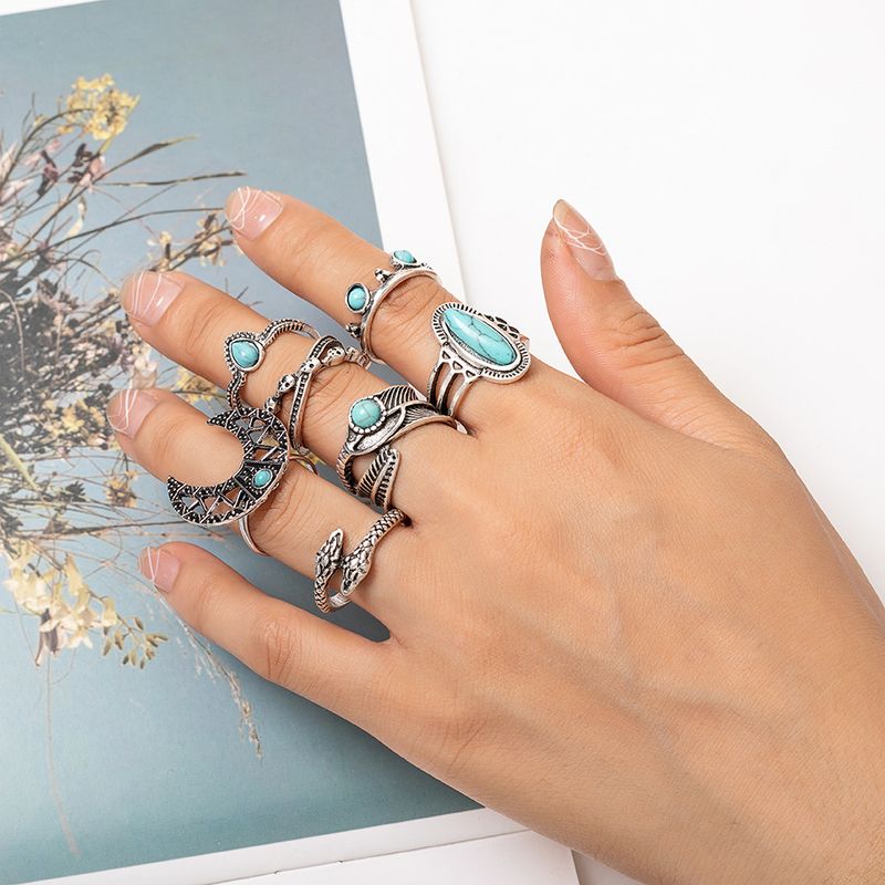 New Ring Bohemian Turquoise Moon Feather Snake Shape 7-Piece Ring Set