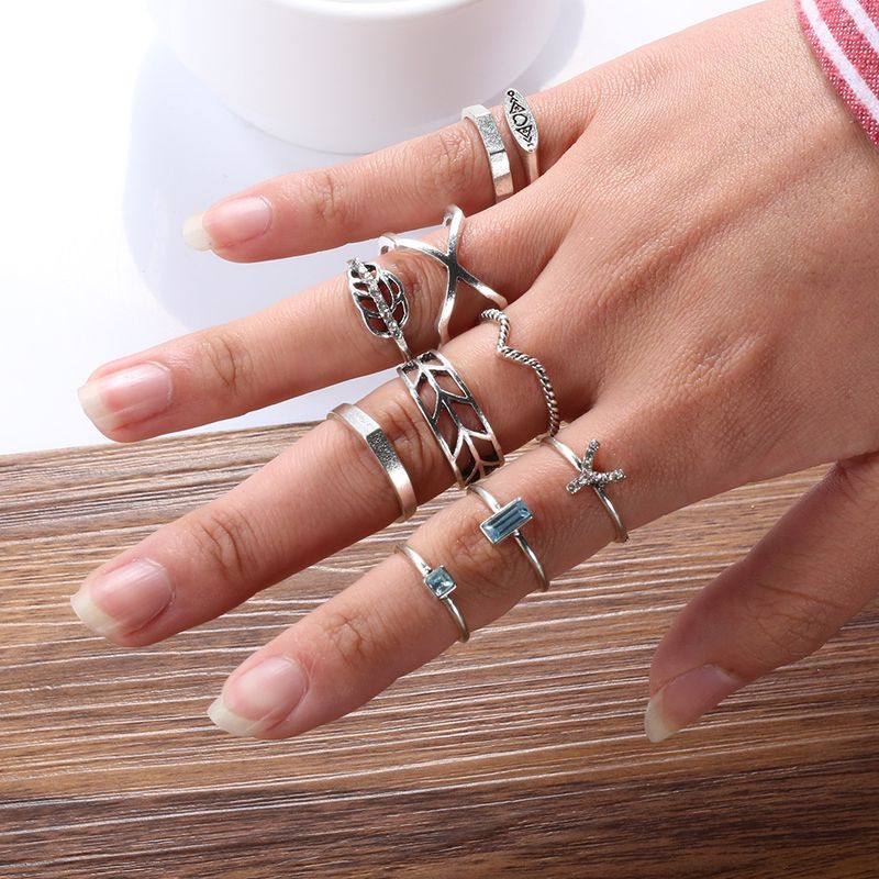 Nuovo set di gioielli di moda da dieci pezzi: anelli con diamanti intarsiati a forma di foglia e lettera, eleganti e unici