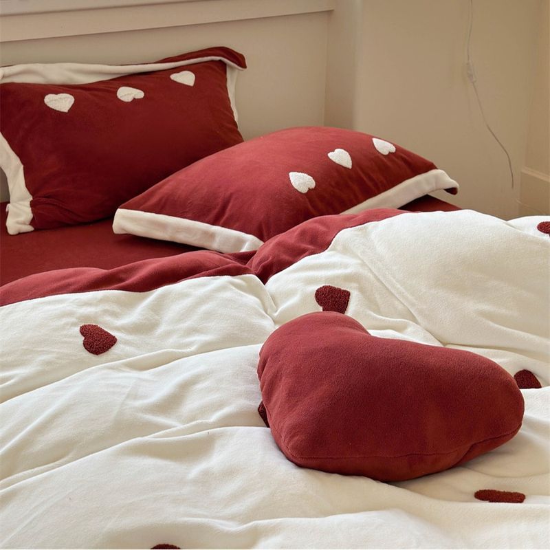 2025 Fall/Winter New Red Heart Embroidered Milk Velvet Four-Piece Set Warm Coral Fleece Duvet Cover