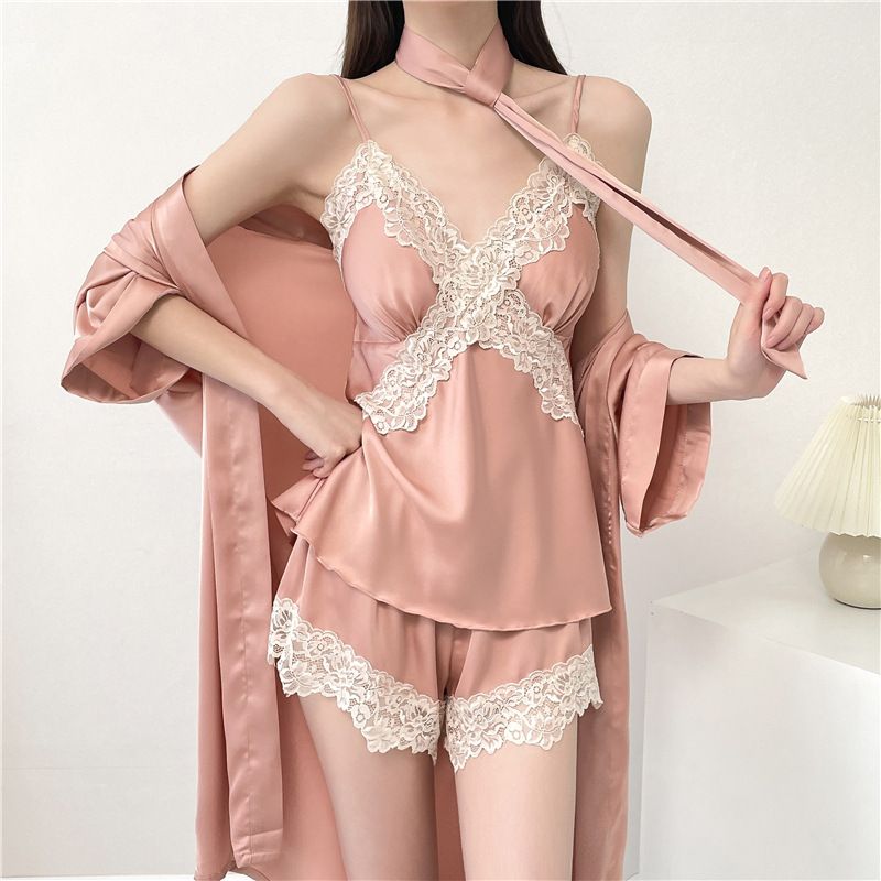 New summer ice silk sleepwear women's suspender nightgown set lace sexy pure desire thin home clothes can be worn outside