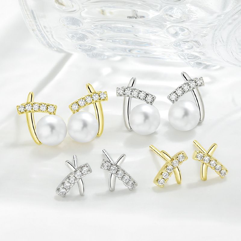 Orecchini a bottone a X semplici e compatti con diamanti, di alta qualità, con lettera personalizzata e croce di perle