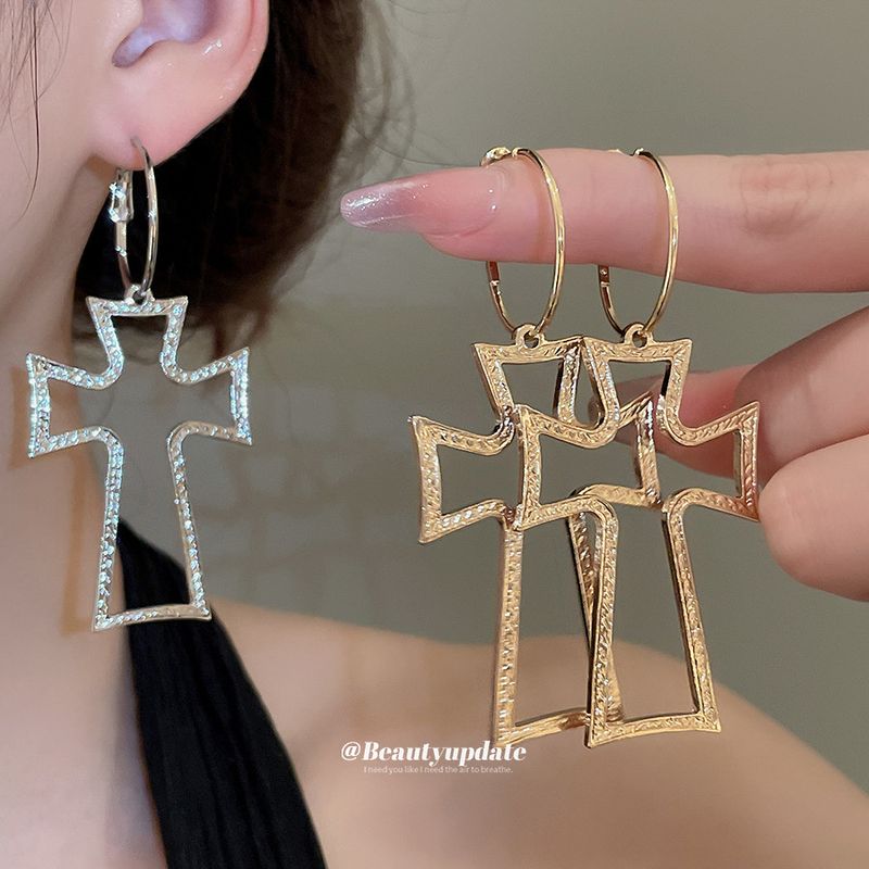 Orecchini a cerchio rotondi con ciondolo a croce cavo e rugoso in argento, gioielli per le orecchie alla moda, design unico