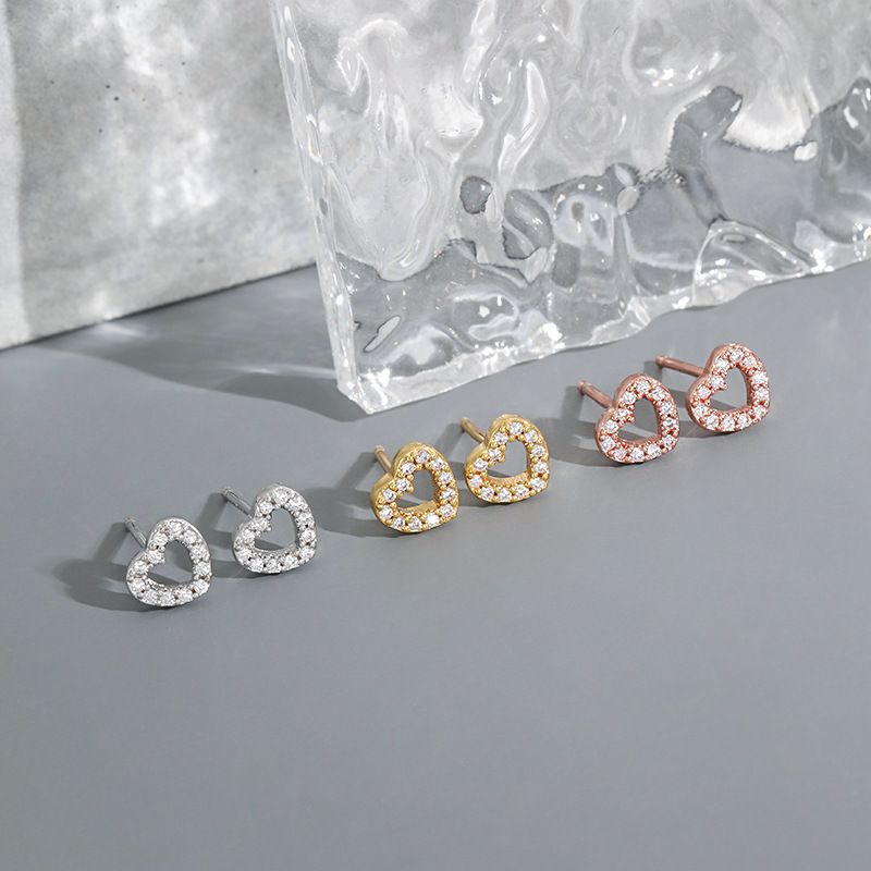 Orecchini a forma di cuore color pesca con micro-intarsi di diamanti, orecchini a forma di cuore freschi e semplici a forma di amore.