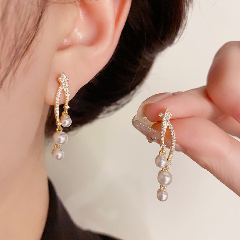Niche High-End Zircon Cross Line Pearl Tassel Earrings Light Luxury Elegant Socialite Versatile Ear Drops