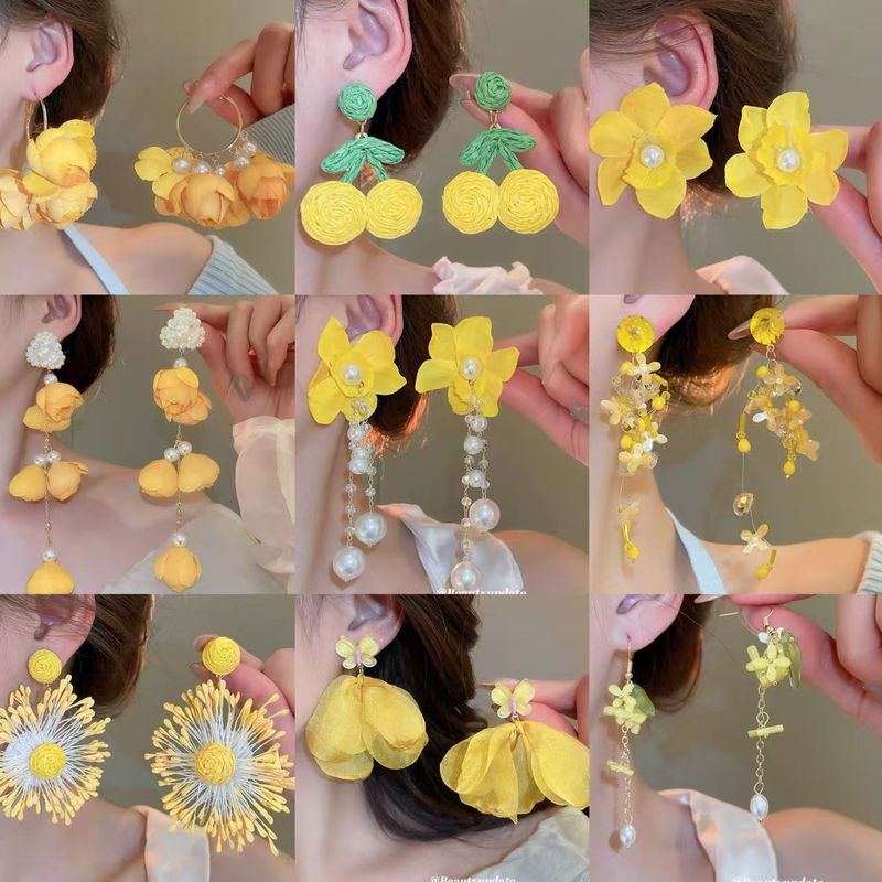 Orecchini di lusso di alta gamma, leggeri e alla moda, con aghi d'argento e fiori gialli, stile foresta super fatato, primavera estate