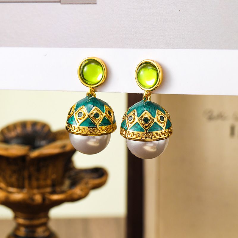 Palace style drop oil enamel Chinese style earrings, pearl earrings, high-end feeling, light luxury temperament, and medieval earrings