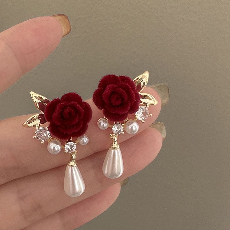 Orecchini eleganti di alta qualità con perle e fiori di rosa in velluto rosso autunnali e invernali, nuovi 2024_voghion.com