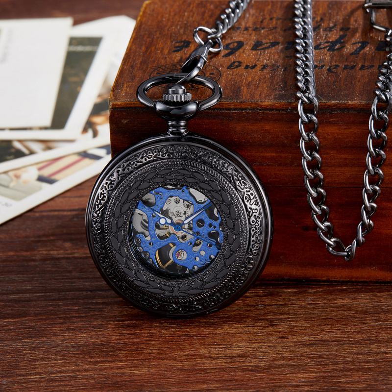 Orologio da tasca meccanico manuale multifunzionale con lente d'ingrandimento nera in acciaio al tungsteno, unisex, con custodia a scatto, regalo antico