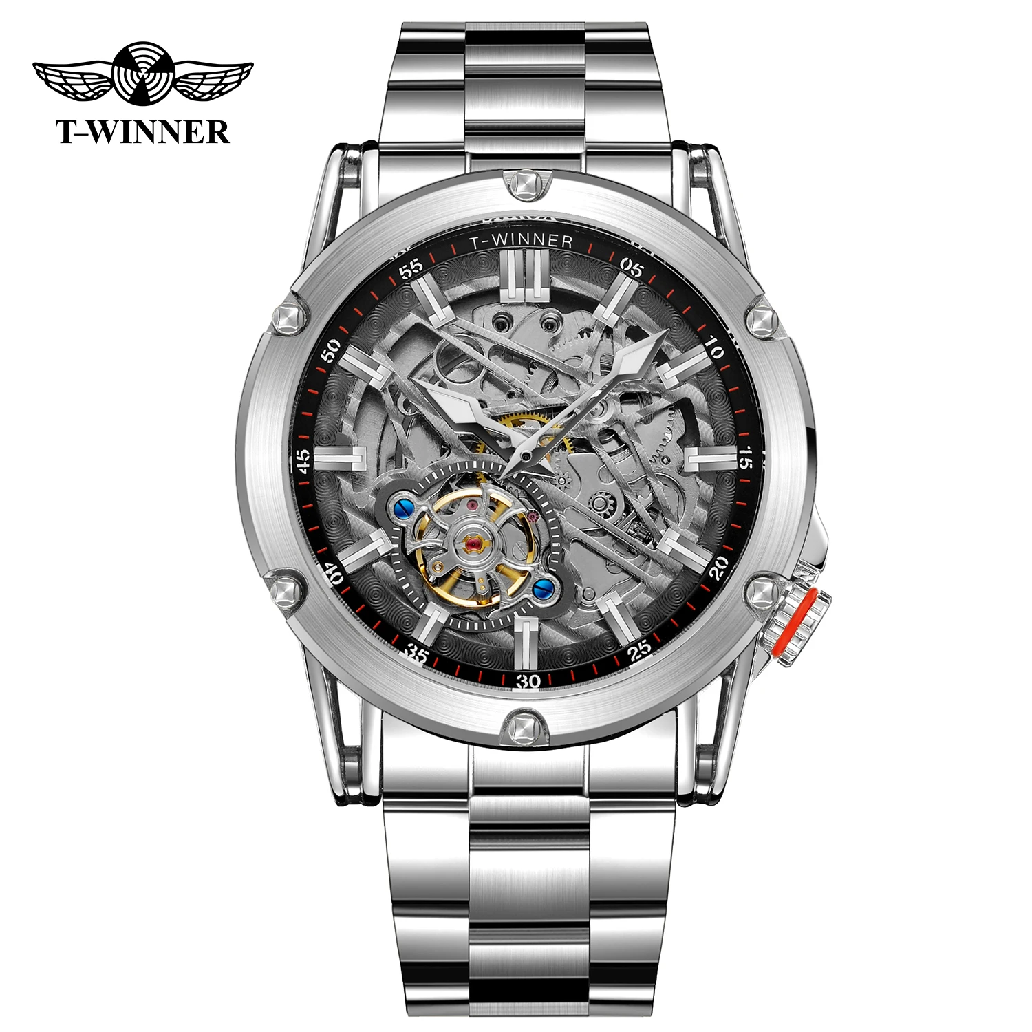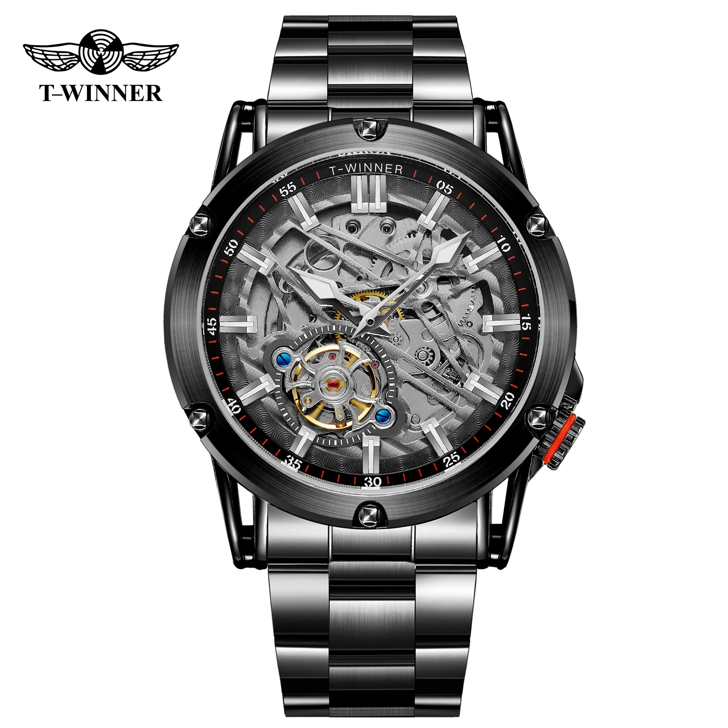 Orologio da uomo di lusso di alta qualità WINNER, grande, in acciaio inossidabile, con scheletro, tourbillon, movimento automatico, orologio meccanico militare maschile