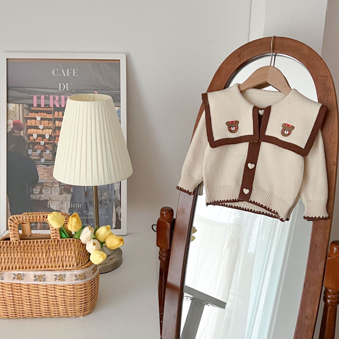 Children's Little Girl Doll Collar 2024 Autumn/Winter New Cute Little Bear Pattern Big Flip Collar Women's Cardigan Knitted Sweater