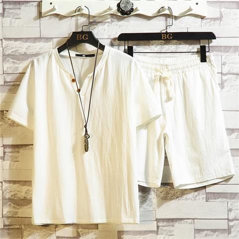 Pantaloncini LazyZoom in cotone a maniche corte per uomo, stile cinese, estivi, alla moda, casual, sportivi, in lino, due pezzi