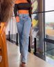 Pantaloni in denim svasati attillati elasticizzati con bottoni a vita alta da donna