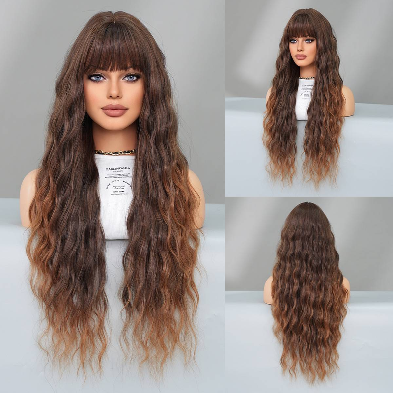 Parrucca castana ondulata con capelli ricci e lunghi, copricapo completo