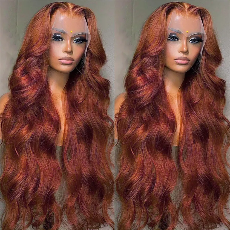 Parrucca frontale in pizzo con onde del corpo color castano rossiccio, 13x6 HD, trasparente, senza colla, pre-pizzicata