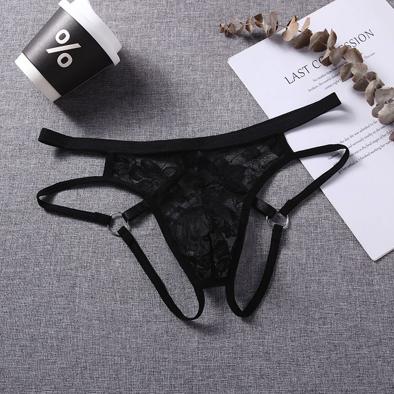Perizoma da uomo in pizzo, sexy e trasparente, con scritta T, con apertura sul cavallo, vita bassa e tasche cave