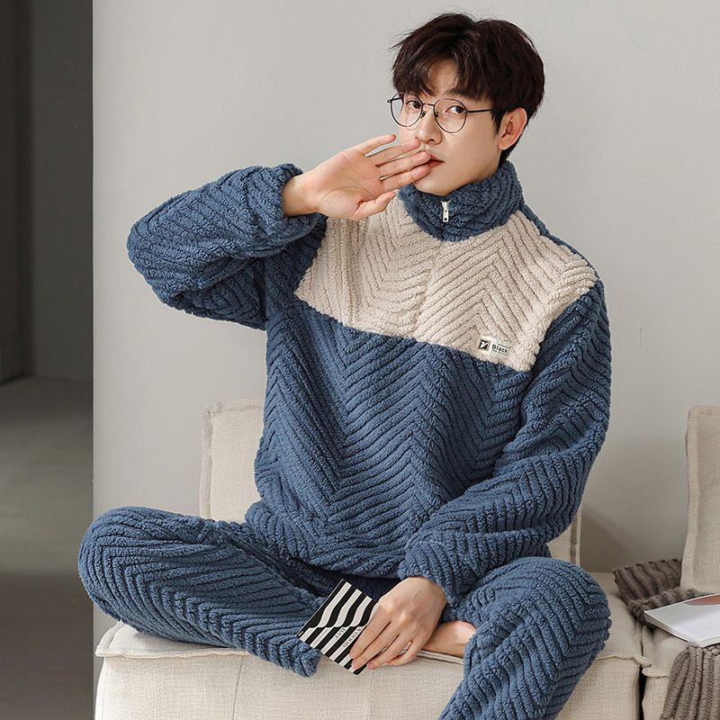 Pigiama da uomo caldo in pile corallo autunno inverno con velluto spesso e vestibilità ampia può essere indossato fuori casa a maniche lunghe