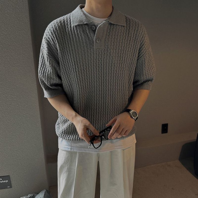 MYQ Summer Thin Breathable Turn-down Collar Knit Shirt Men's Loose Short Sleeve Polo Shirt Korean Style Commuter Outfit