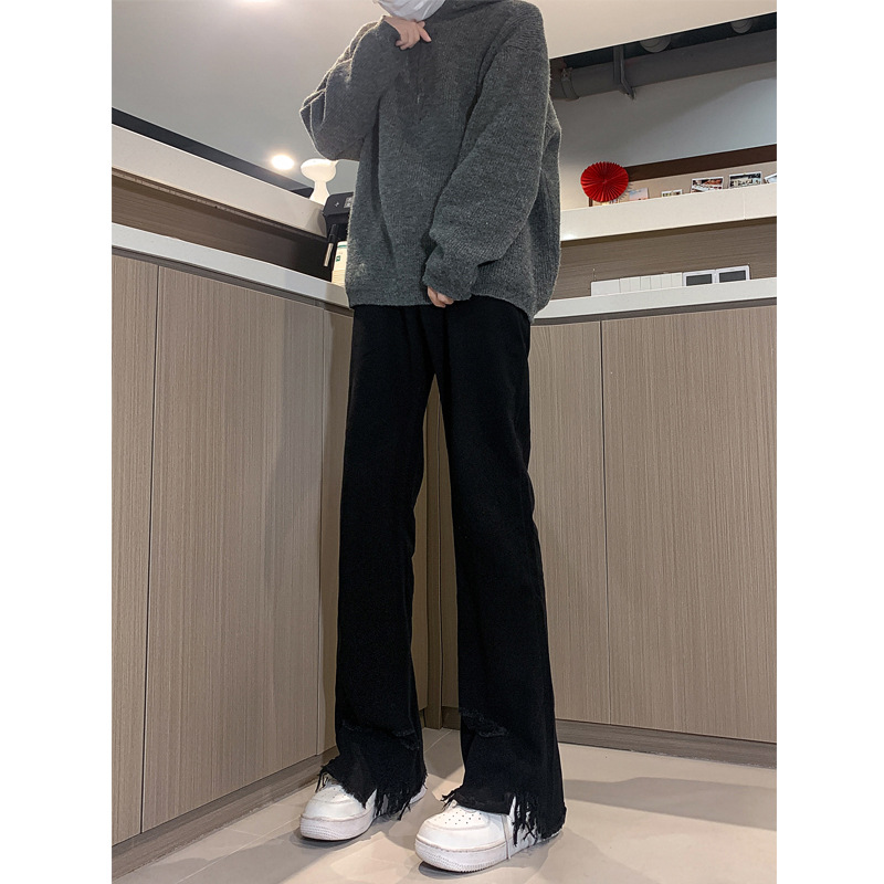 Pure black micro flared jeans with frayed edges and holes, slim fit and elongated American high street pants, men's red and handsome straight leg casual pants
