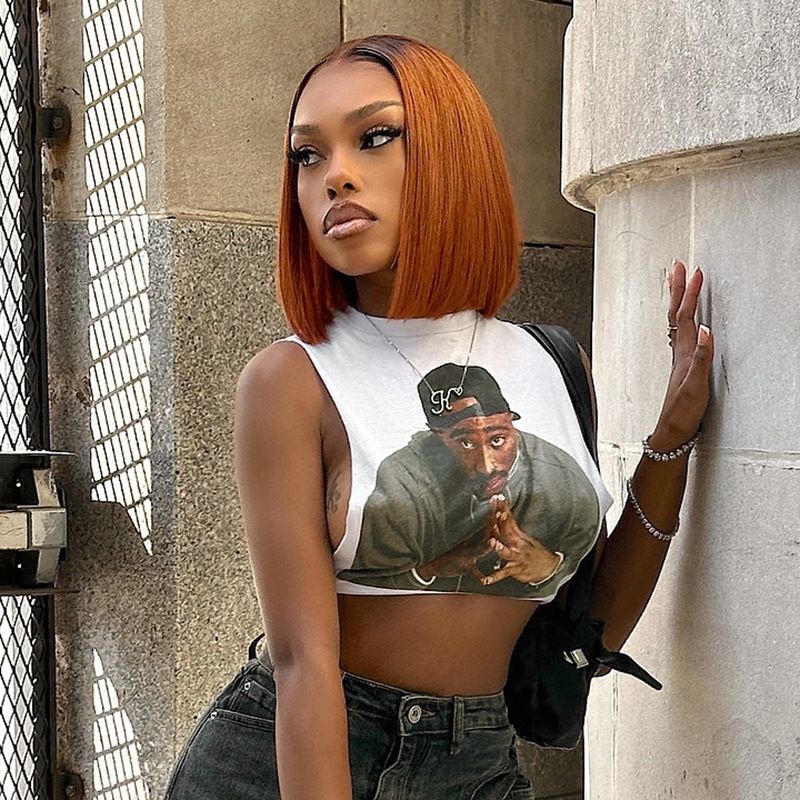 Q24TP320 Canotta corta senza maniche con scollo rotondo, stampata in 3D, da donna, estiva, trendy