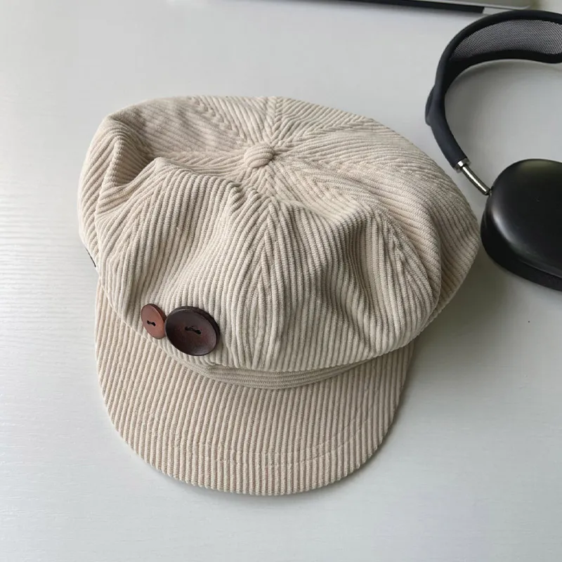 RICYGVM Berretto ottagonale in velluto a coste con bottoni retrò per donne, cappello da pittore, artista, ragazze giapponesi, berretti con visiera marroni, berretti autunnali e invernali