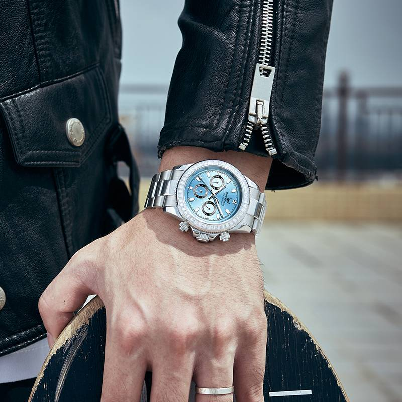 ROERDUM Blue Heart Ice Series - Orologio meccanico tri-cronografo da uomo - Cinturino in acciaio inossidabile, quadrante blu ghiaccio, impermeabile, stile minimalista di lusso