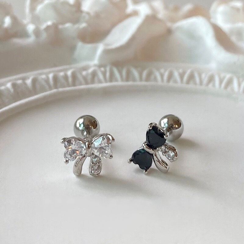 S Argento puro coreano osso auricolare nero bianco zircone fiocco nodo semplice vite ritorta chiodo cocleare piccoli e squisiti orecchini