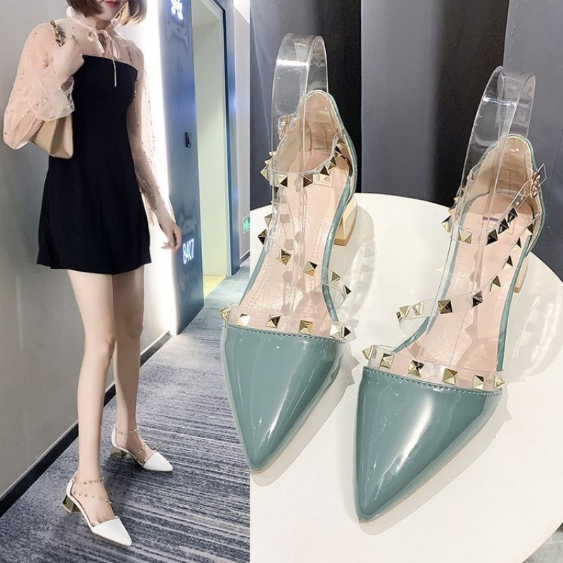 Pointed rivet sandals women's spring and summer 2024 new all-match thin transparent one-word buckle belt thick heel square root