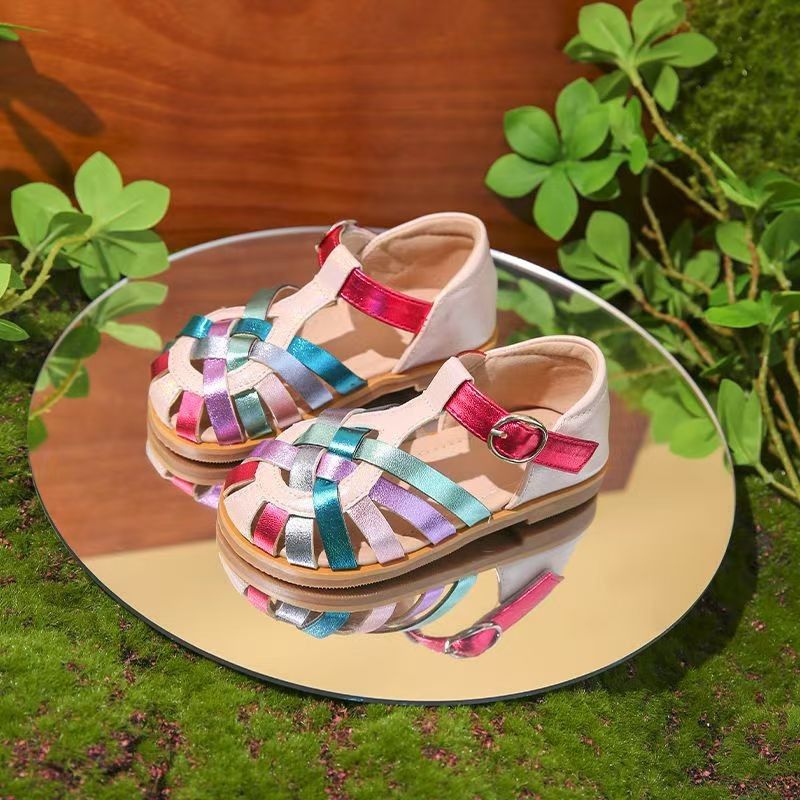 Sandali da bambina con punta chiusa, stile estivo 2025, scarpe intrecciate colorate con suola morbida anticollisione, carine e cave per bambini