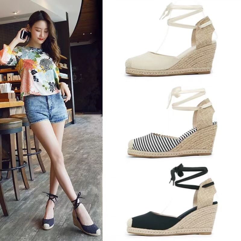 Sandals Women's Summer French Slope Heel Grass Knitted Headband High Heel Thick Sole Fisherman's Shoes Women's Canvas Bohemian Strap Sandals