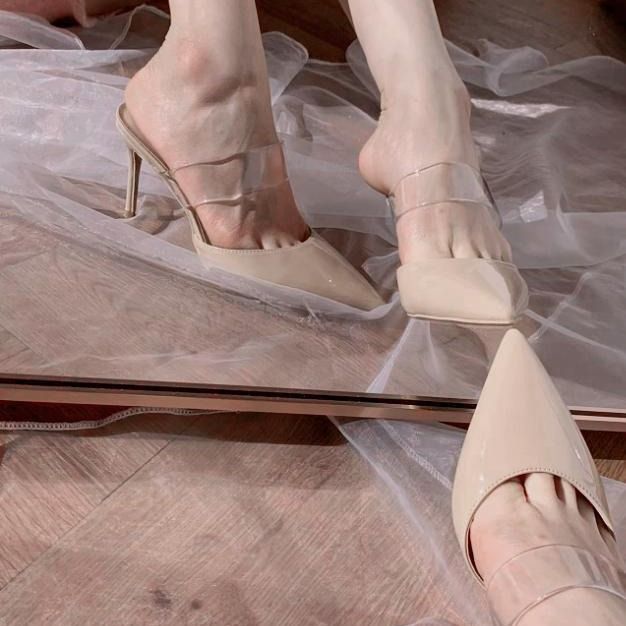 2025 Summer Sandals Lacquer Leather High Heels Cool Straw Thin Straw Transparent Headband Half Straw Outerwear Slippers