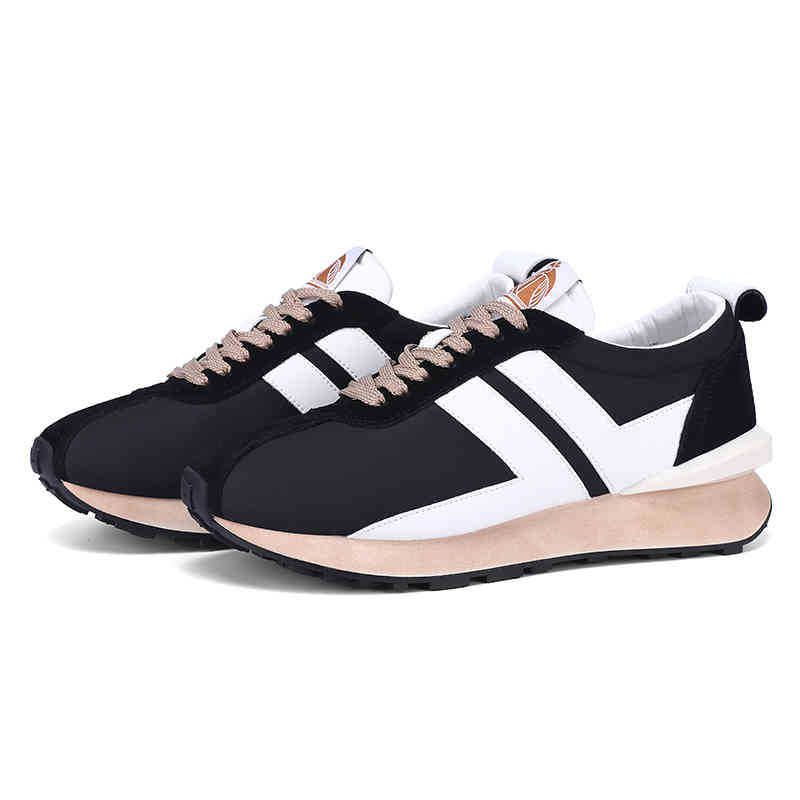 Scarpe 2025, semplici sneakers alla moda da uomo, colori principali neri e bianchi con motivi bianchi, lacci delle scarpe marrone chiaro