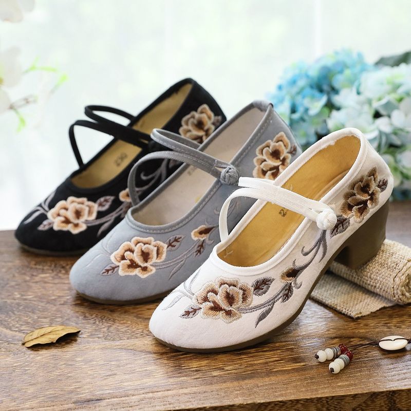 Scarpe da ballo Mary Jane in tessuto ricamato da donna, con tacco alto e spesso, con tacco quadrato singolo