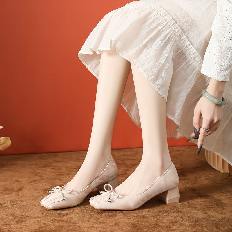 Scarpe da ballo singole in raso rosa con fiocco primaverile per donna, punta quadrata, tacco grosso, tacco alto, stile piccolo e profumato, di alta qualità