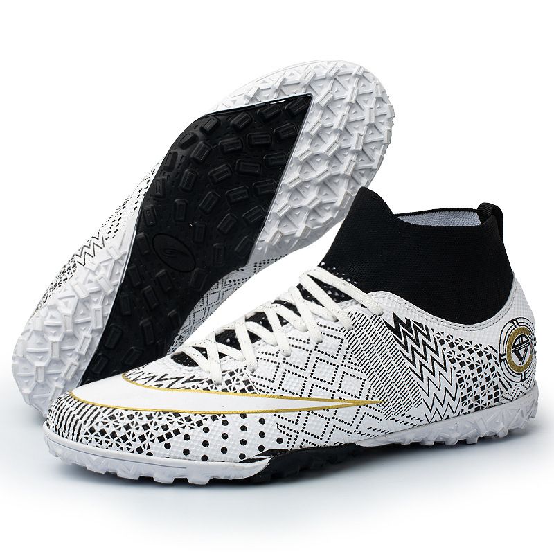 Scarpe da calcio alte per ragazzi e ragazze con tacchetti in gomma, scarpe da allenamento nere e bianche