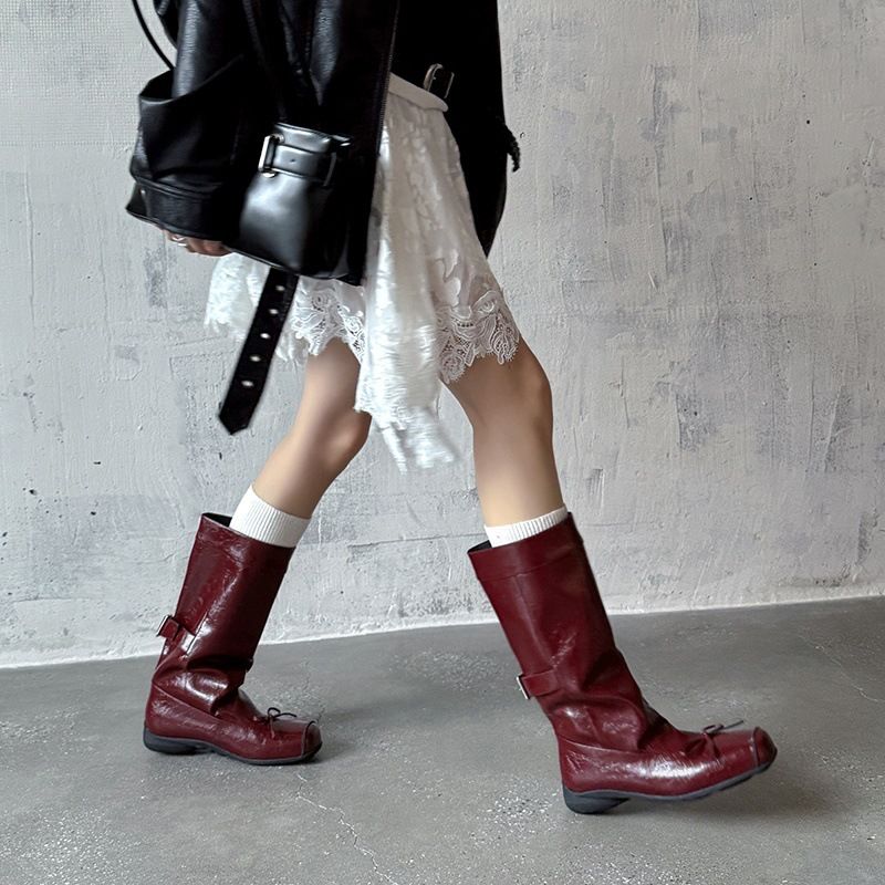 Scarpe da donna con fiocco a gamba larga, scarpe da donna slip-on con tacco medio, punta quadrata, stile autunno/inverno 2025, alla moda e versatili.