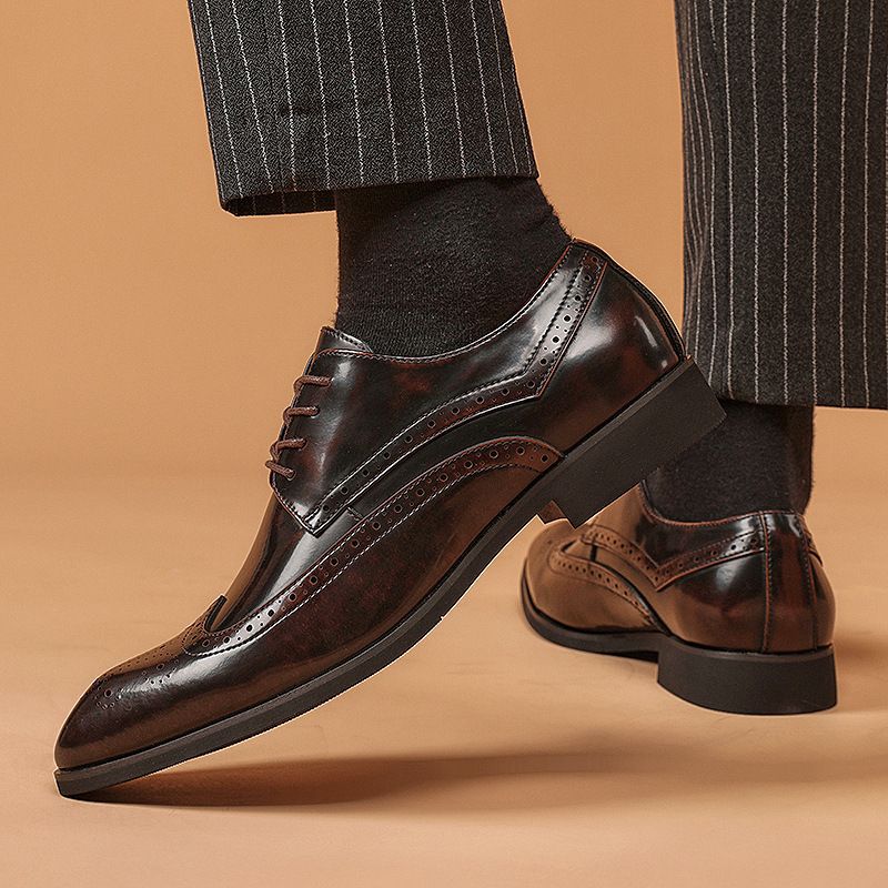 New Patent Leather Glossy Business Formal Pointed Toe Carved Brogue Men's Shoes British Derby Shoes Soft Sole